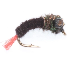 Deze donkere nimf is gebonden met een fluor staartje en 2 kleine ogen.