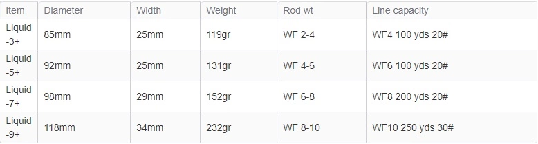 | Liquid-7+ | 98 mm | 29 mm | 152 gr | WF 6-8 | WF8 180 m 20 lb |